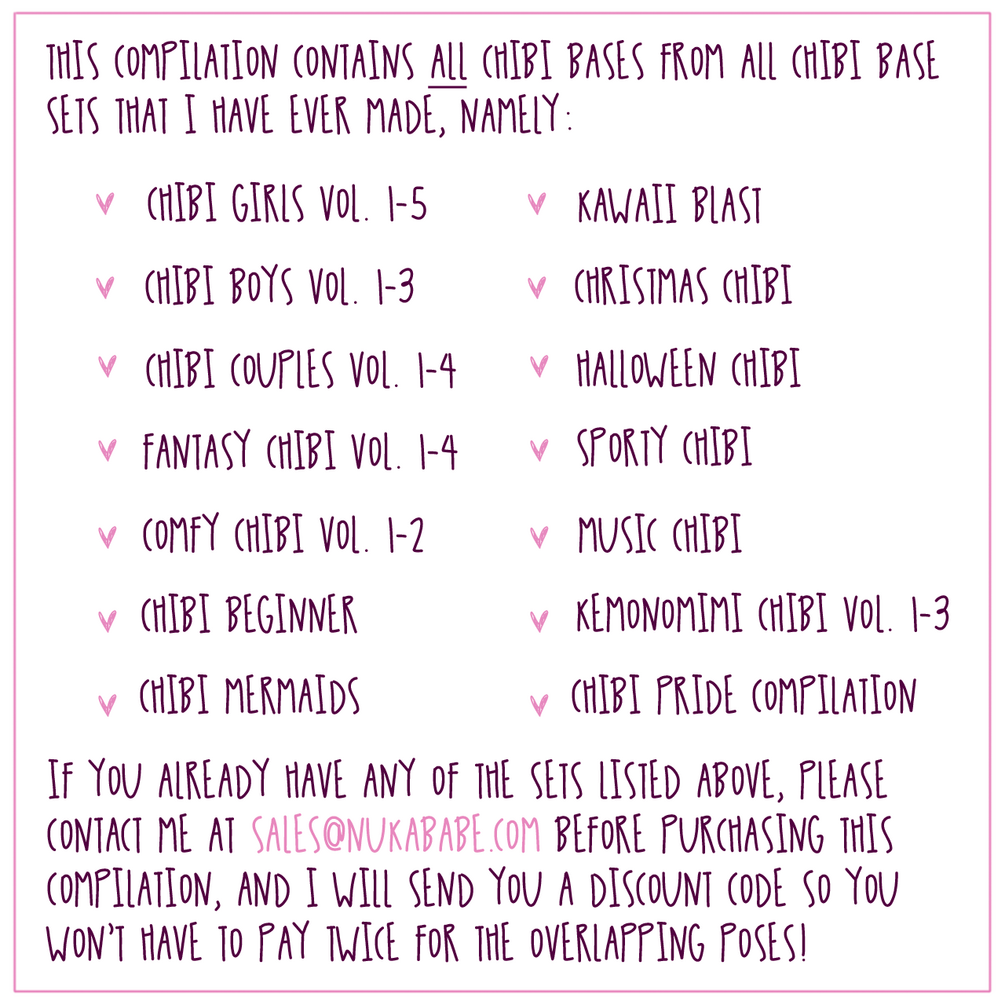 This chibi stamp bundle for Procreate contains all the chibi bases I have ever made! It includes 800 high quality chibi bases organized into 29 collections (28 original sets plus a Chibi Pride compilation and a bonus folder!).