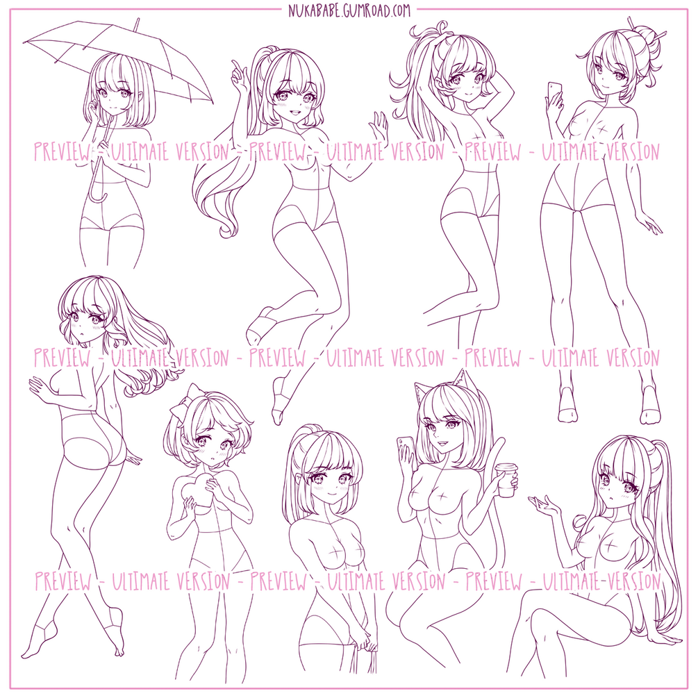 This figure stamp set for Procreate contains 30 high quality female poses in anime and manga style geared towards commonly used compositions. Swipe above to see pose previews!
