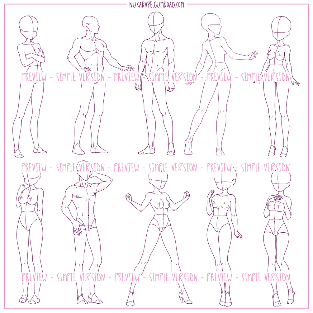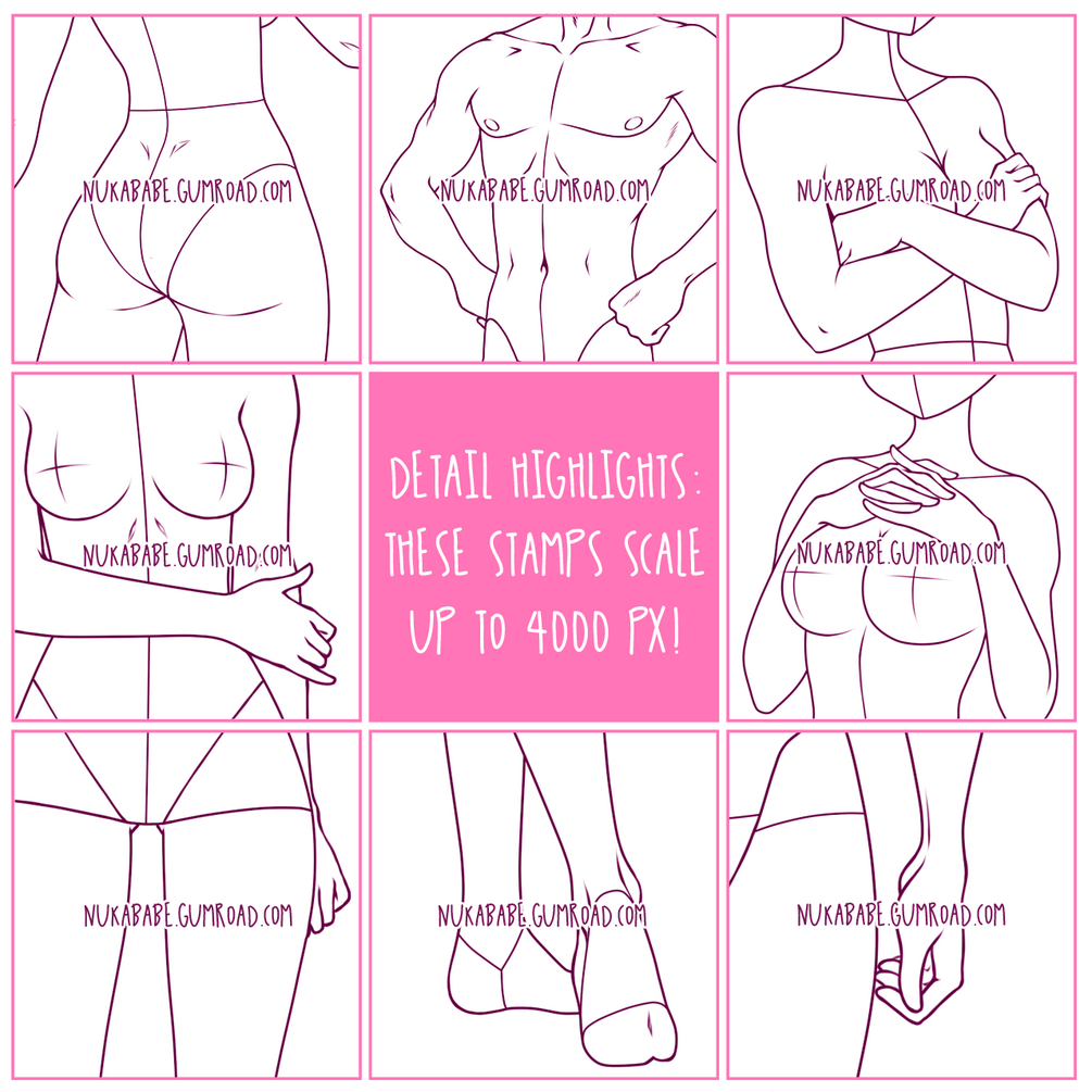 This figure set containing 25 figure stamps (a mix of full-body, head to feet male and female poses) for Procreate is geared towards emerging anime and manga artists as well as character and outfit designers looking for basic poses. High resolution PNG stamps are included as well, so that the figures from this pose set can be loaded into every other drawing and painting software supporting PNG format, including Photoshop, PaintTool SAI, and Clip Studio Paint!
