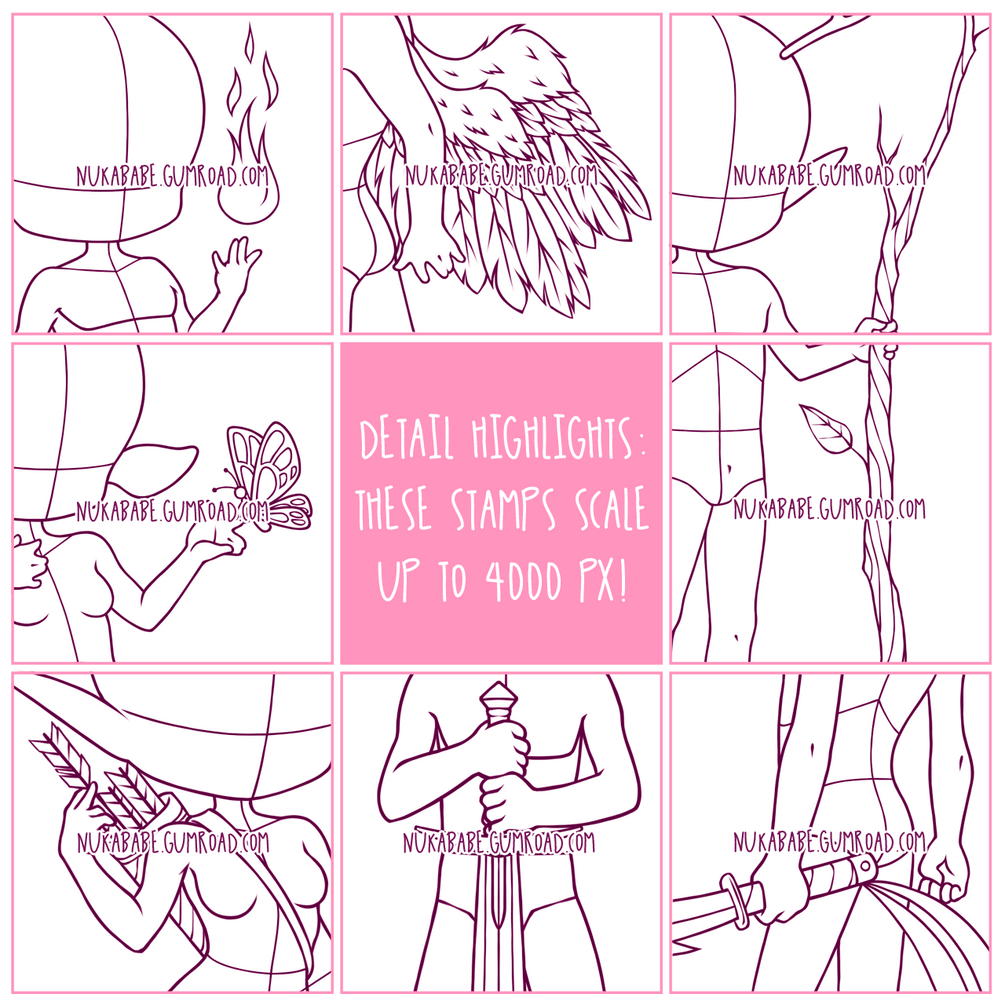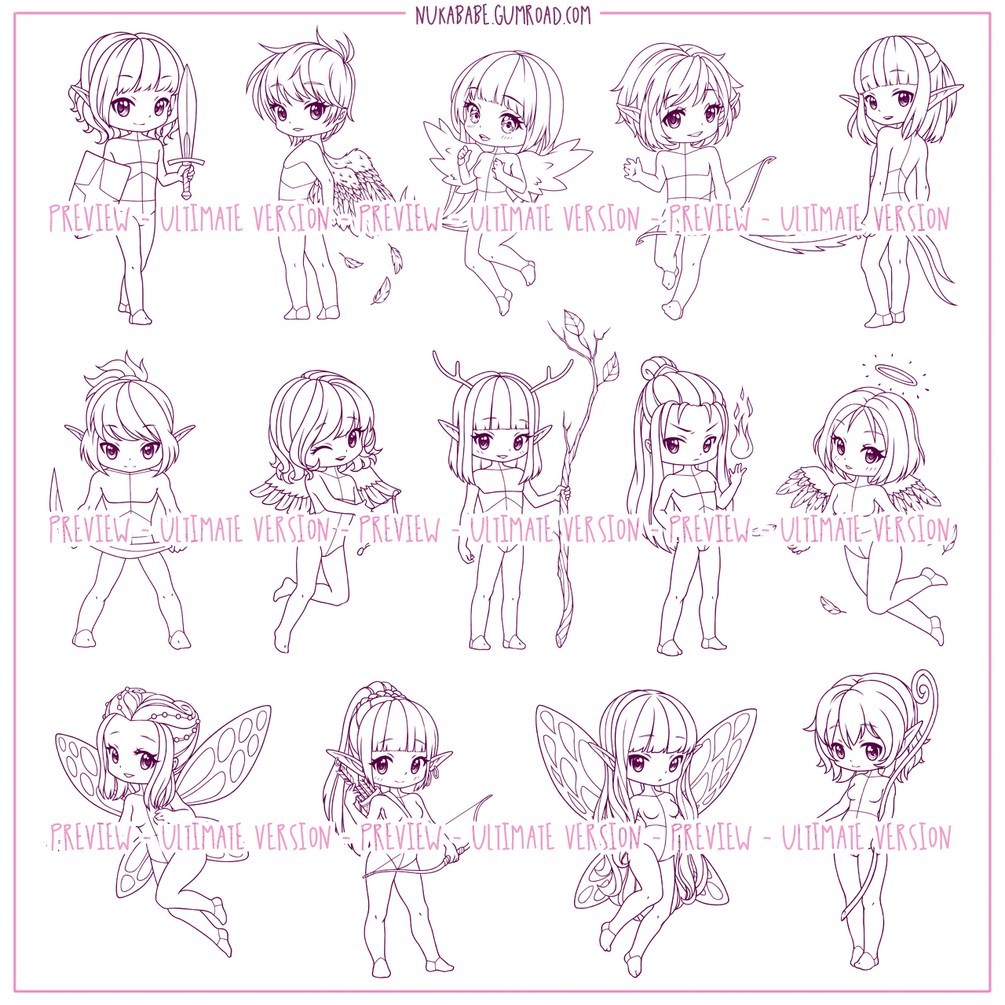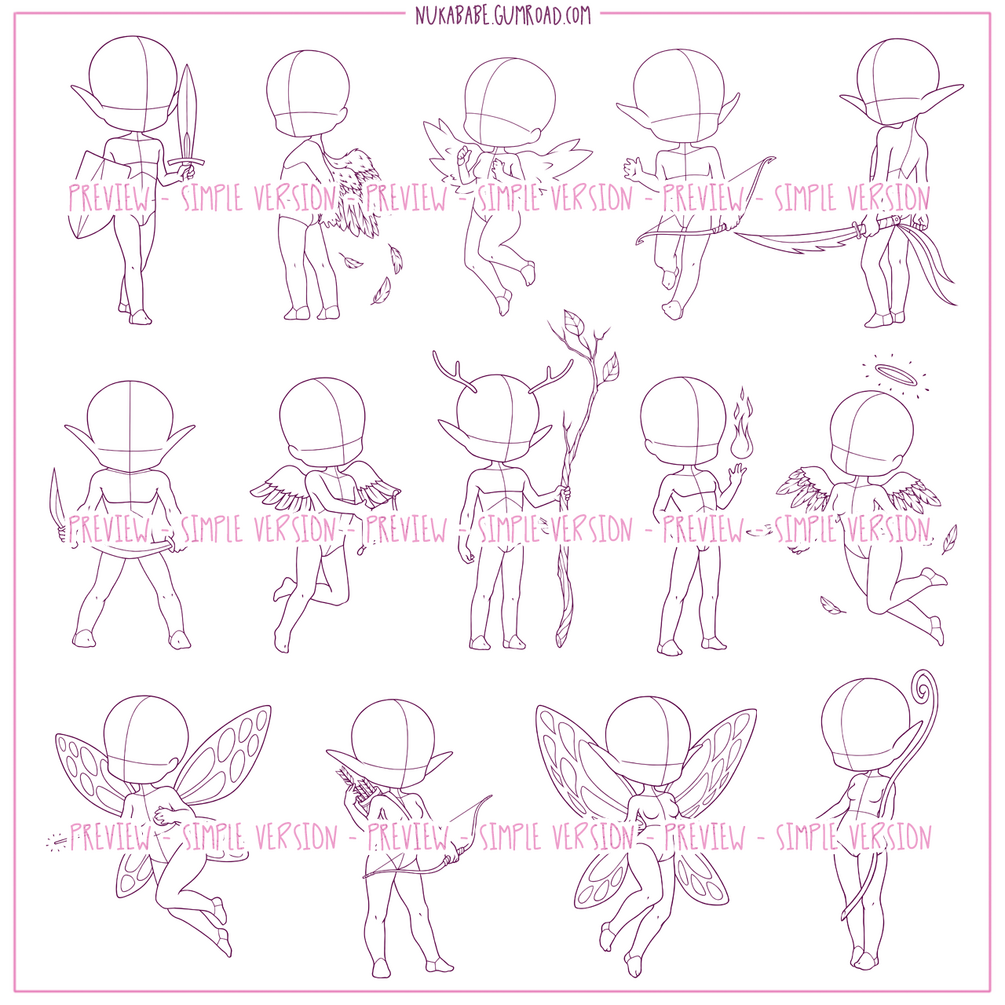 Fantasy books and comics have always been a great source of inspiration for me, so I simply couldn't help creating this chibi base set! It contains 30 chibi / cartoon style outlines of elves, fairies, angels, and warriors, girls and boys (and one elf couple). The body stamps from this set have professionally developed facial and body guides to help you with proper placement of clothing and other design elements. While there are many dynamic poses in this stamp set, there are several static poses as well that will work great for character reference sheets and adoptables. High resolution and precise linework of these bases make it possible to use them not only for learning and practice, but also for commercial projects.