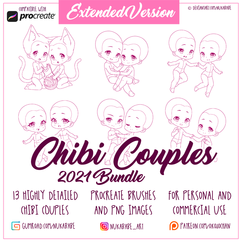 This bundle includes all 13 couple chibi bases that I made in 2021 ^^ Each base is an individual large PNG file with transparent background. Procreate brush sets are supplemented with individual high resolution PNG files with transparent background, so you can use these poses in other drawing and painting apps, including PaintTool SAI, Clip Studio Paint, and Photoshop!