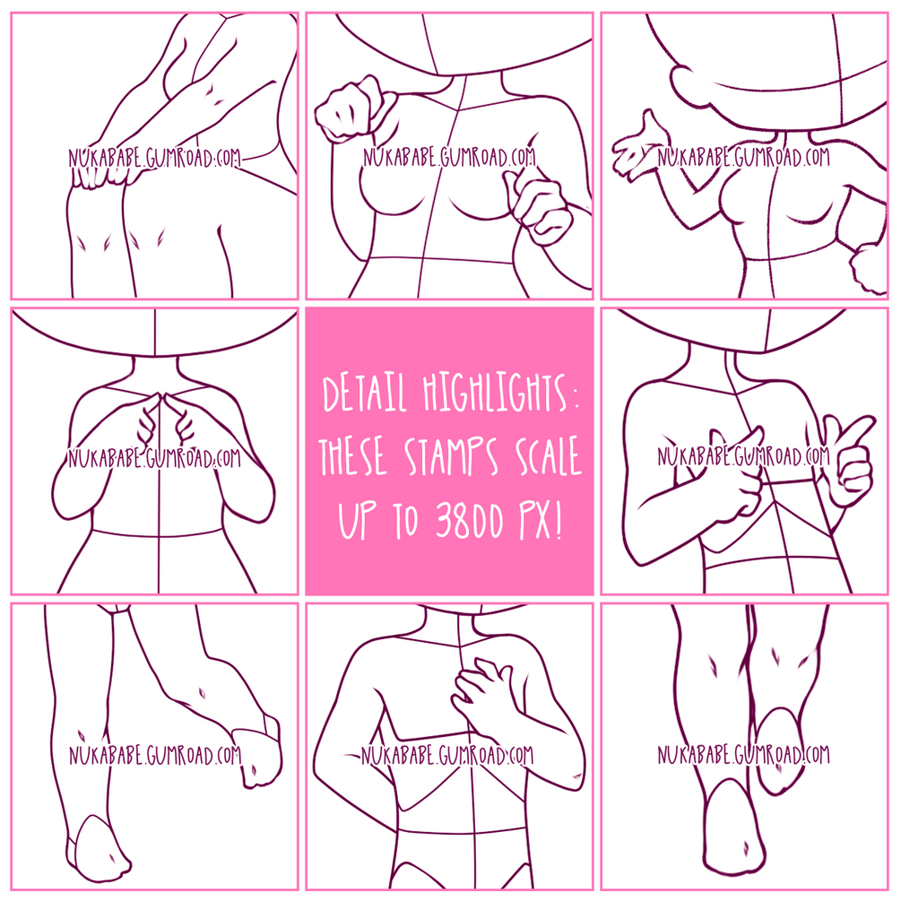 This bundle includes 48 basic chibi poses geared towards emerging artists and character designers. It contains basic chibi poses that represent different types of chibi figure - from cartoon-ish to kawaii, from more realistic to more deformed - so you can experiment with different variations of chibi style and find the ones that suit you best! Whether you need drawing references for practice and learning or bases for character designs and fashion illustration, this stamp pack will provide you with lots of helpful material to work with. A variety of gestures featured in this pack makes it fun and educational, and special anatomical guides present on each figure will help you with outfit placement.