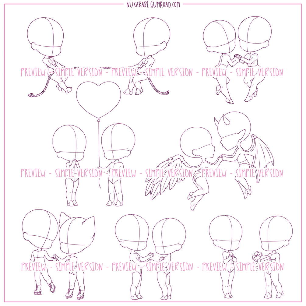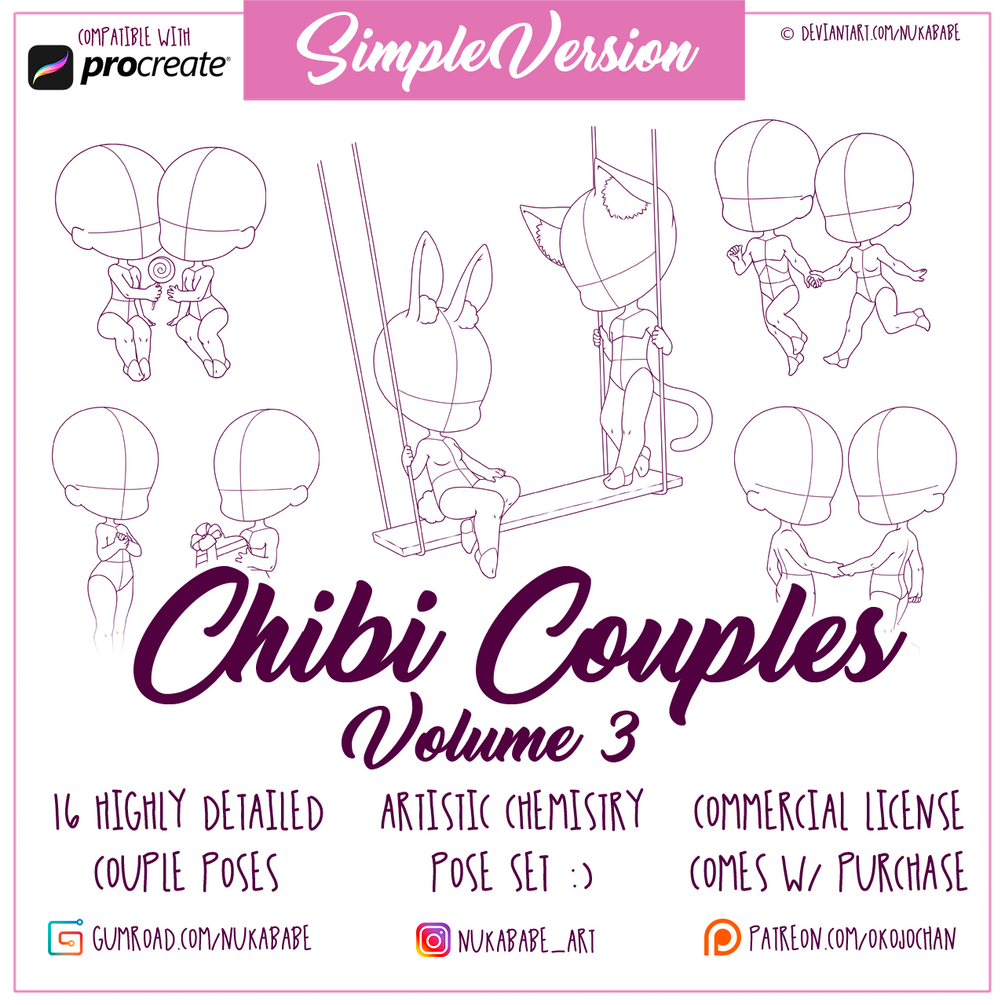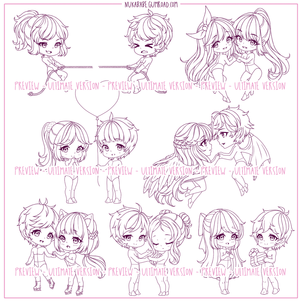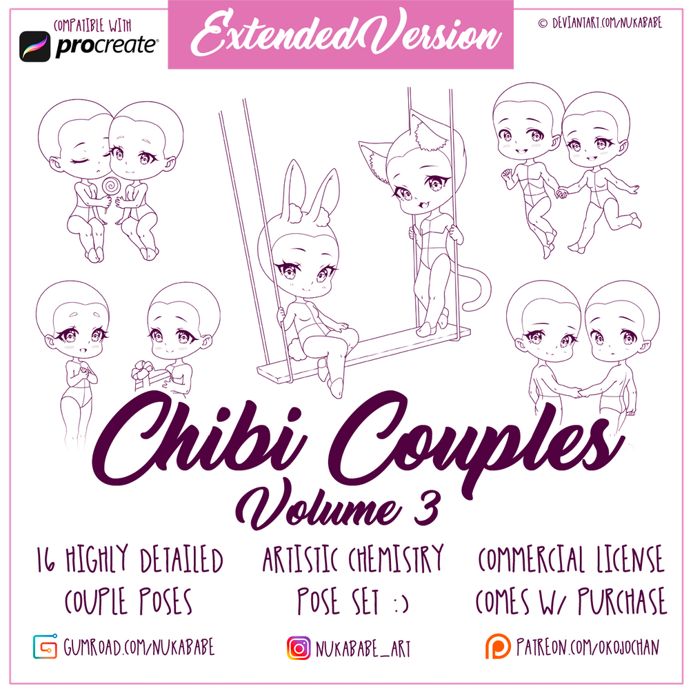 This stamp set for Procreate contains 16 high quality chibi couple bases. This base pack is inclined towards advanced and themed poses with more details, which makes it a nice addition to Volume 1 and Volume 2 of my chibi couples collection that contain more common and basic type of poses. Like my other couple sets, this one includes same sex and different sex poses.