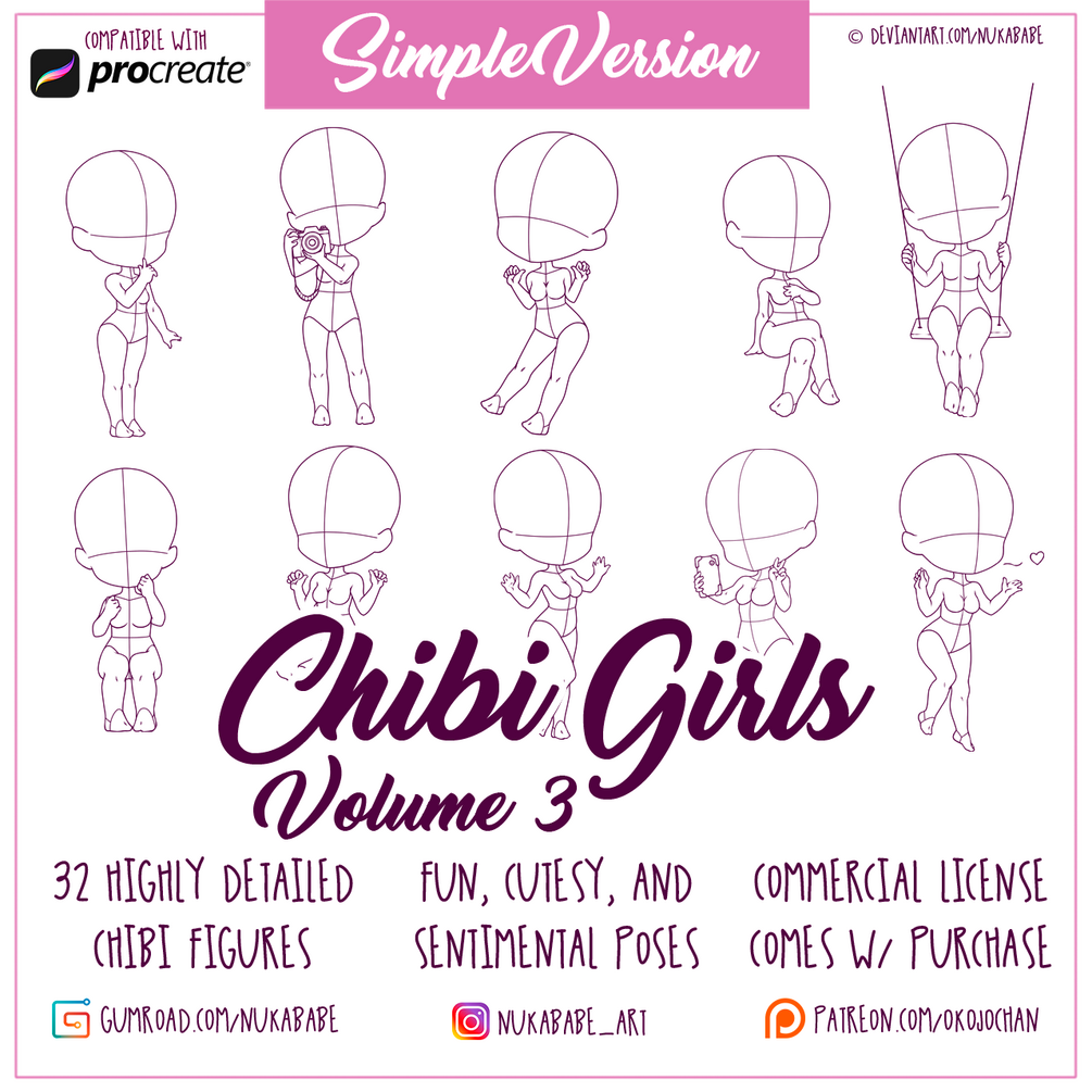 Meet Volume 3 of my chibi girls stamp collection for Procreate! In this chibi base pack, you will find a balanced mix of 32 cutesy, fun, and sentimental female poses in chibi style. Helpful for practice and learning, these chibi stamps can be used as adoptable bases, templates for character design, book illustration, fashion illustration, and many other types of art projects! Each figure brush has special guide lines on it, making it easier to place clothes elements, like skirts and tops, and other parts of your precious character designs!