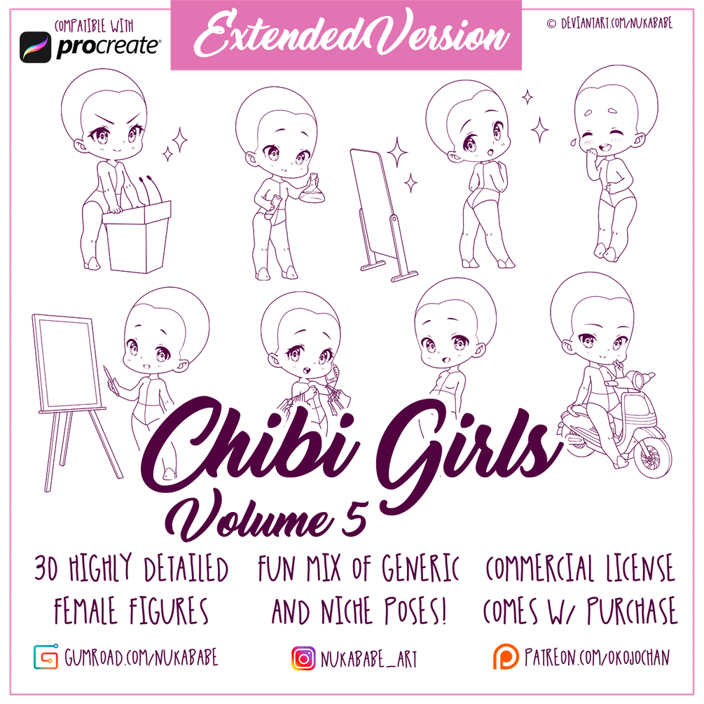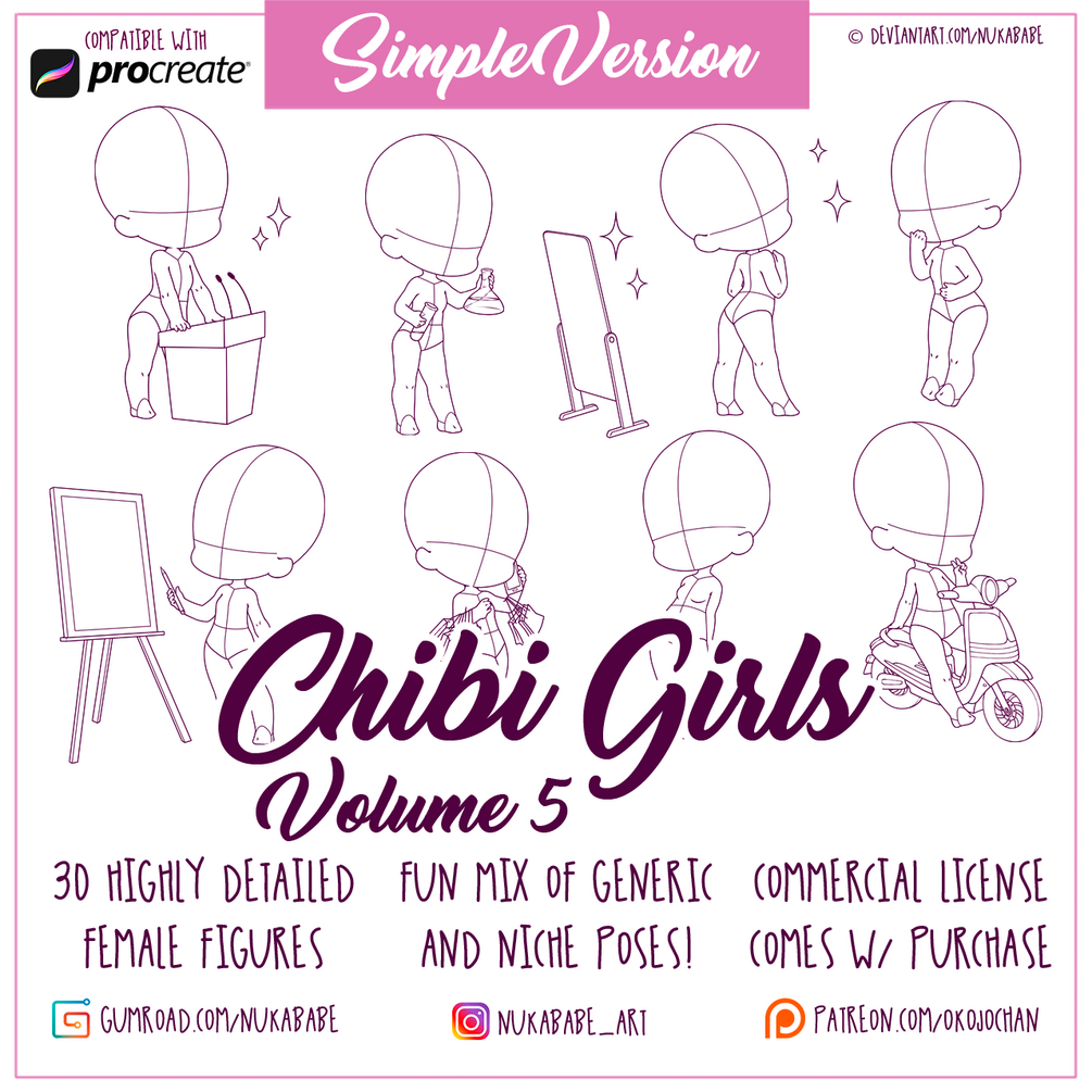 The fifth volume of my chibi girls collection is probably the most diverse pose pack in the series in terms of themes and moods! Looking for a girl on a scooter base? Or a public speaking pose? A chemist girl? A shopping fan girl? If you are looking for specialized poses like these, you will find them in this pose set! Thanks to precise, professionally drawn outlines, every detail of these bases is clear and legible, so you can use them not only for learning and practice, but also for professional art gigs.
