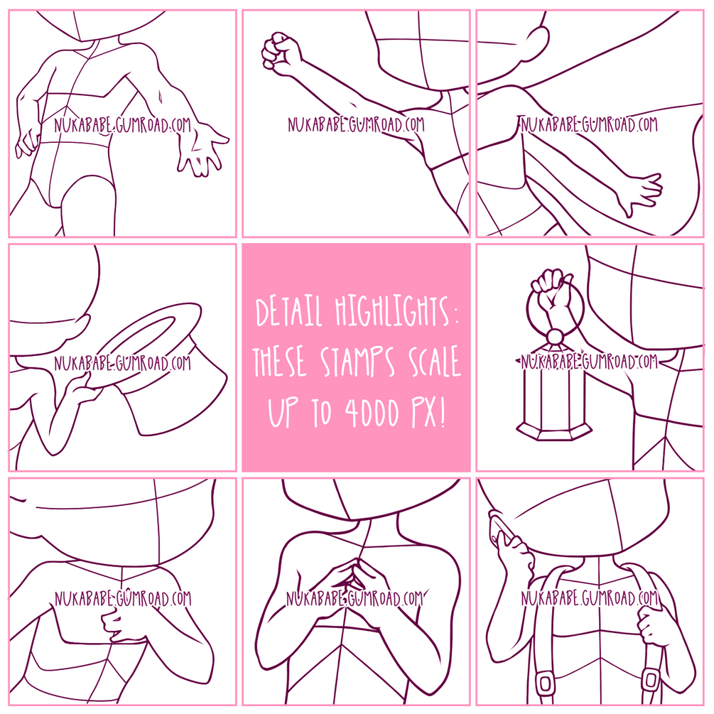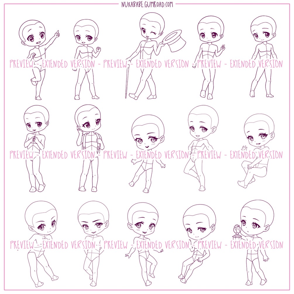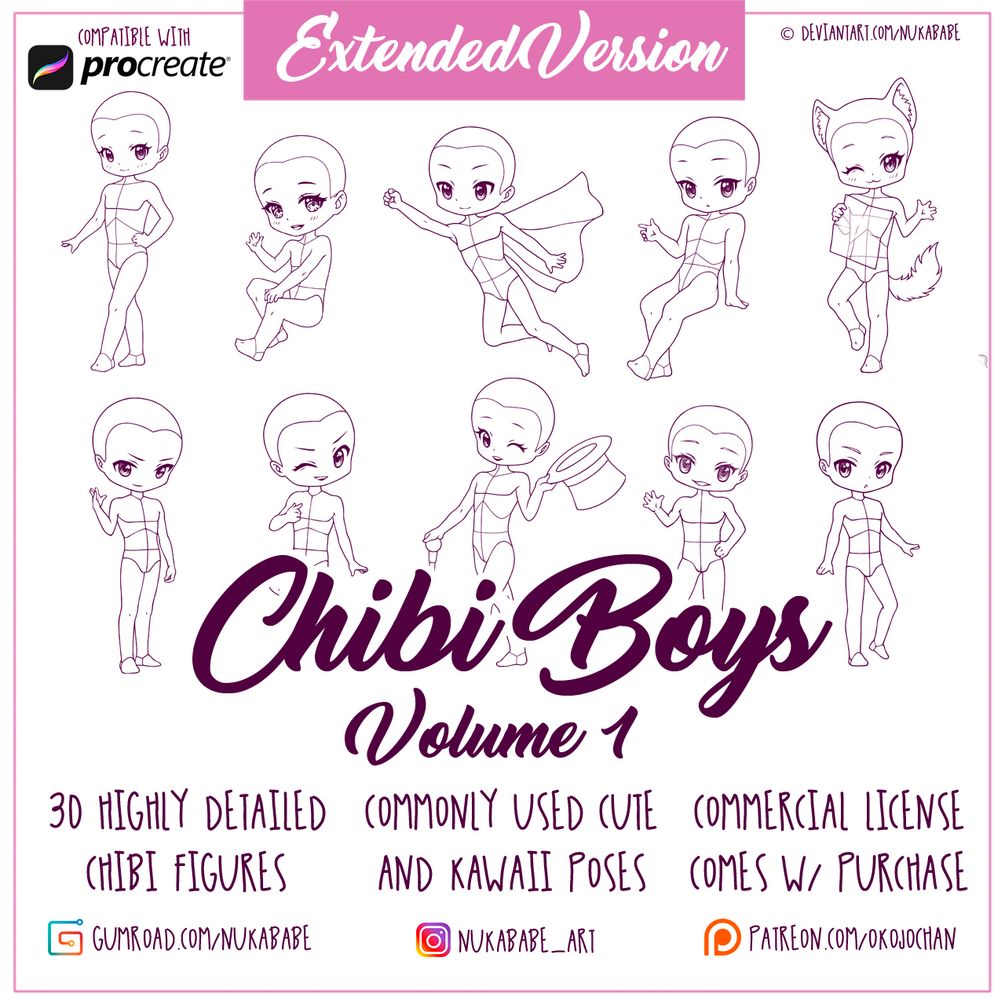 If you are into drawing boys and looking for some fun cartoon stamps for Procreate, you might be in the right place! In this chibi base set, you will find 30 high quality chibi poses with anatomical guides on them. These bases will work great for various types of kawaii and cartoon illustration, particularly for drawing character reference sheets, creating adoptables, and figure drawing practice. The brush set file for Procreate included in this figure stamp set is supplemented with high resolution PNG stamps that can be loaded into most other drawing and painting apps, such as Photoshop, PaintTool SAI, and Clip Studio Paint!