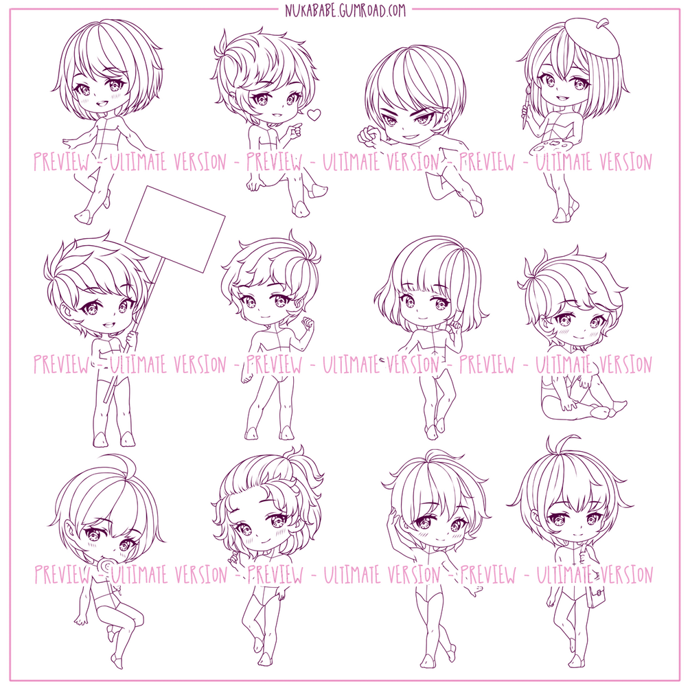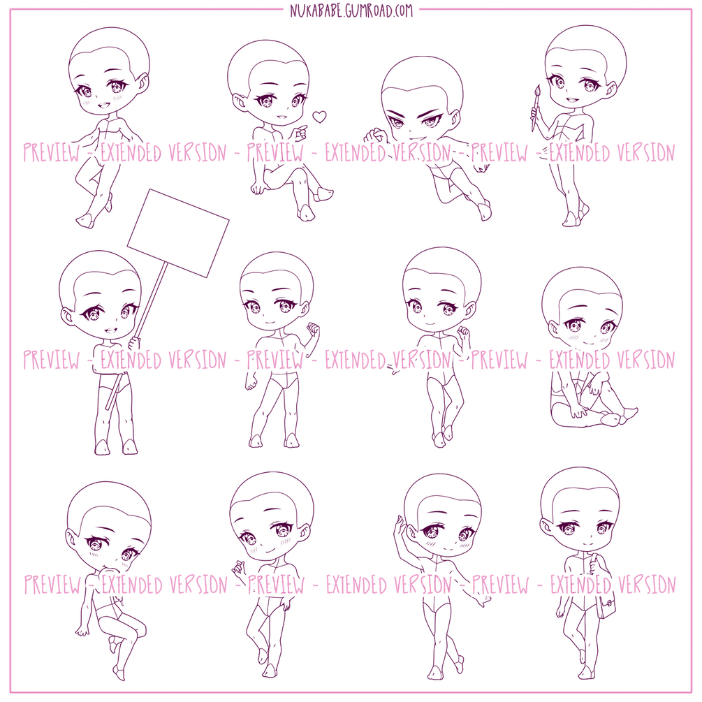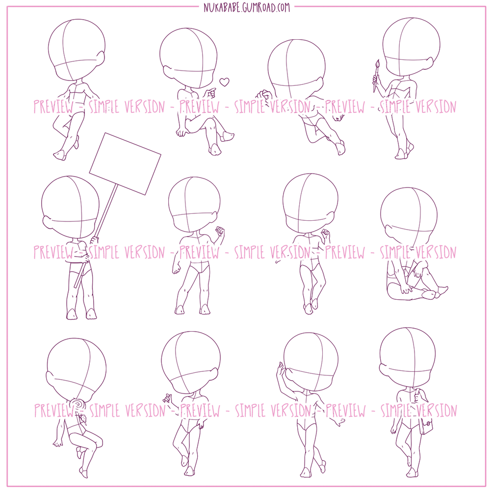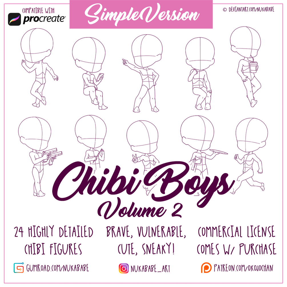 In this chibi base set, you will find 24 high quality stylized chibi poses that will work great for various types of cartoon illustration, particularly for drawing character reference sheets, designing adoptables, and creating action drawings. All stamps from this set have professionally developed facial guides as well as body guides to help you with drawing body features and clothing details of your characters. Procreate brushes included in this set are supplemented with high resolution PNG images so you can use these bases in every drawing software that supports PNG format (Photoshop, PaintTool SAI, Clip Studio Paint and more!)