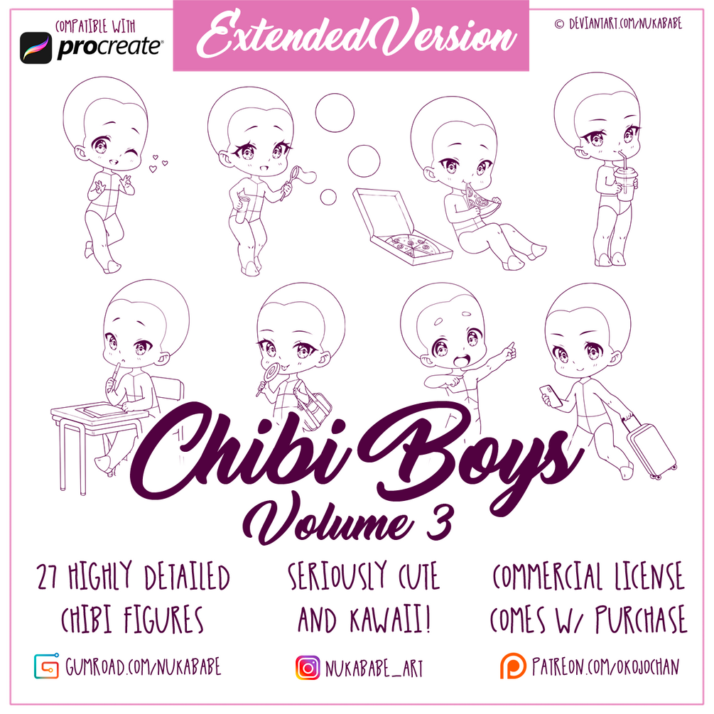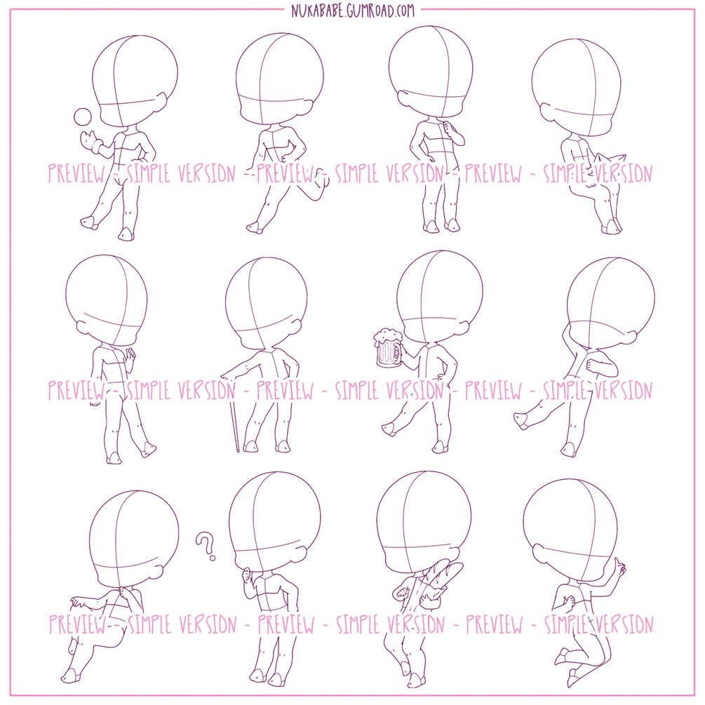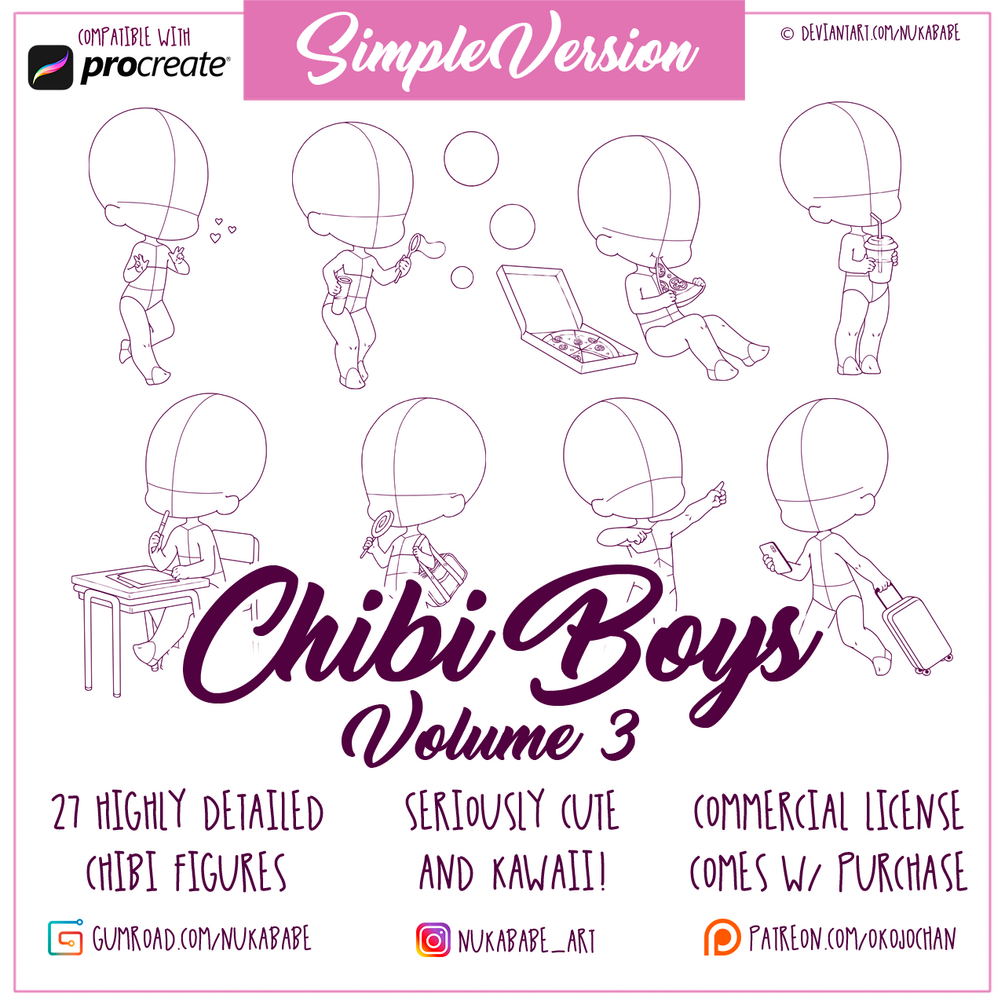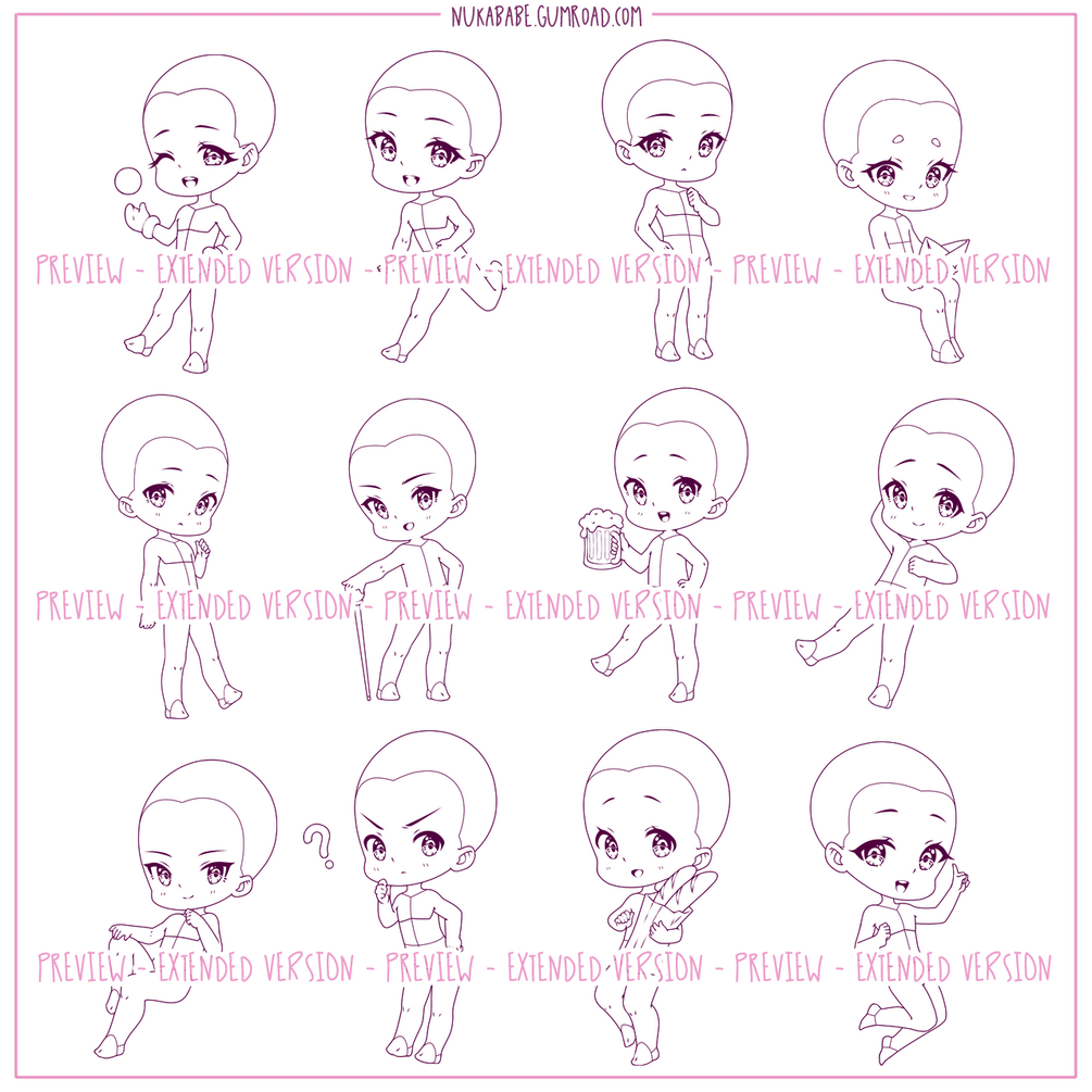 This chibi base collection features 27 sweetest and cutest chibi boy poses handpicked from a pose library that I created during more than five years of my art journey as a chibi artist. Compared to poses from Volume 1 and Volume 2 of my chibi boys collection, the ones from this pack tend to be softer and more rounded although there are a few badass poses among them :D These bases will work great for various types of kawaii and cartoon illustration, particularly for drawing reference sheets, creating adoptables, and drawing practice.