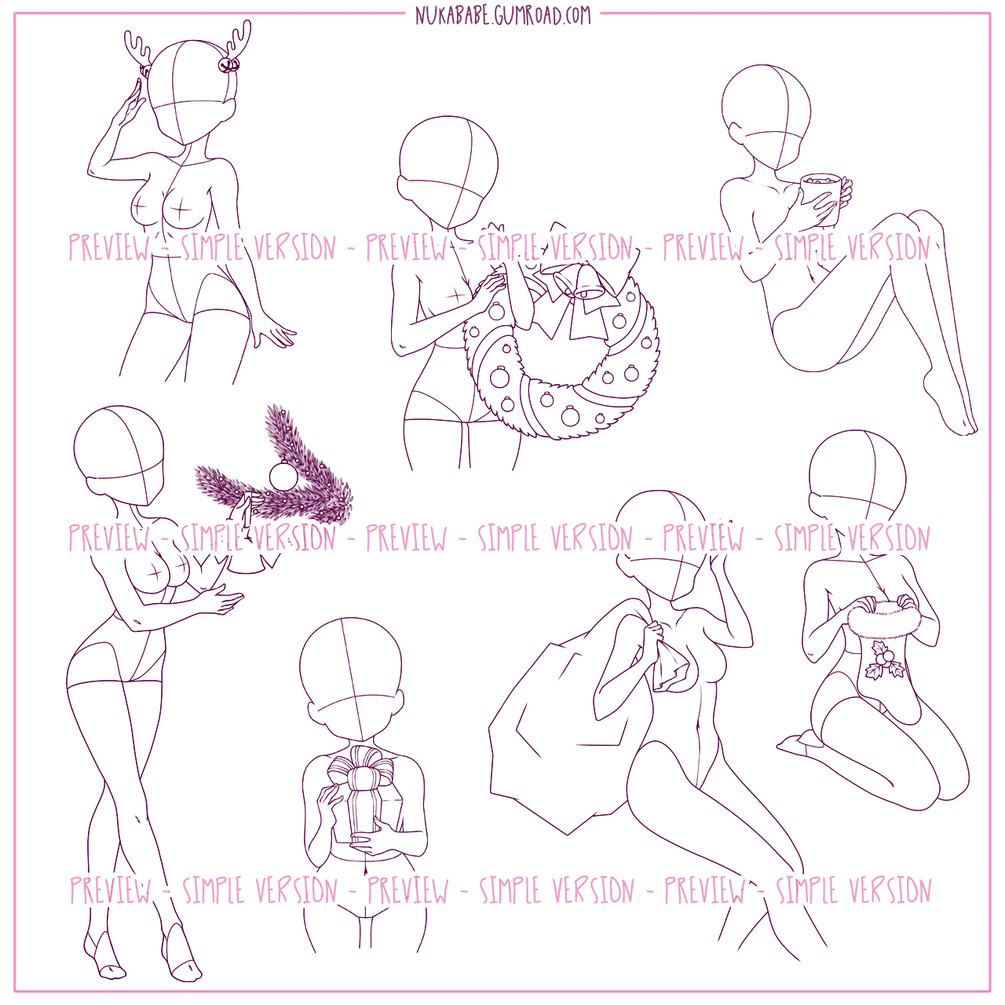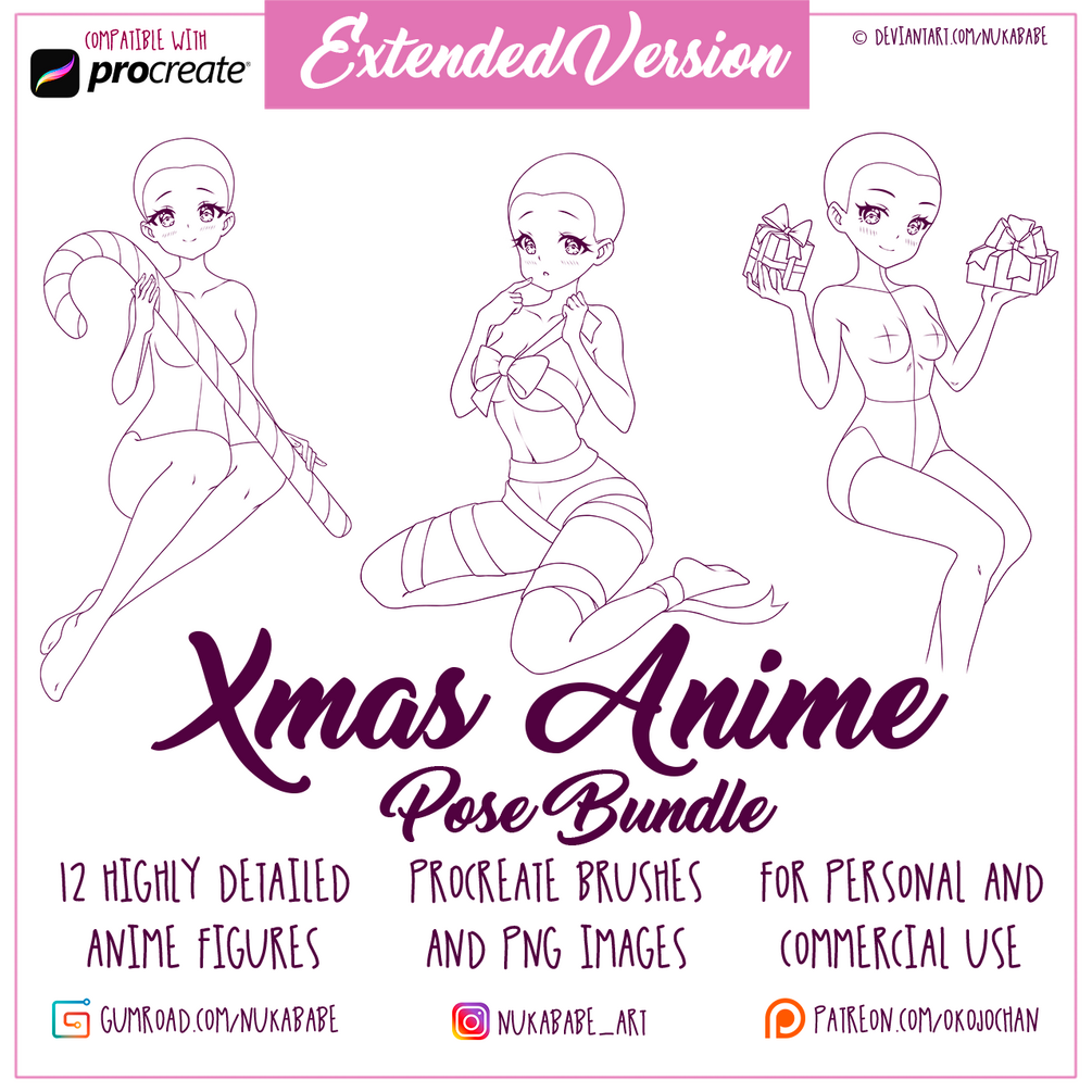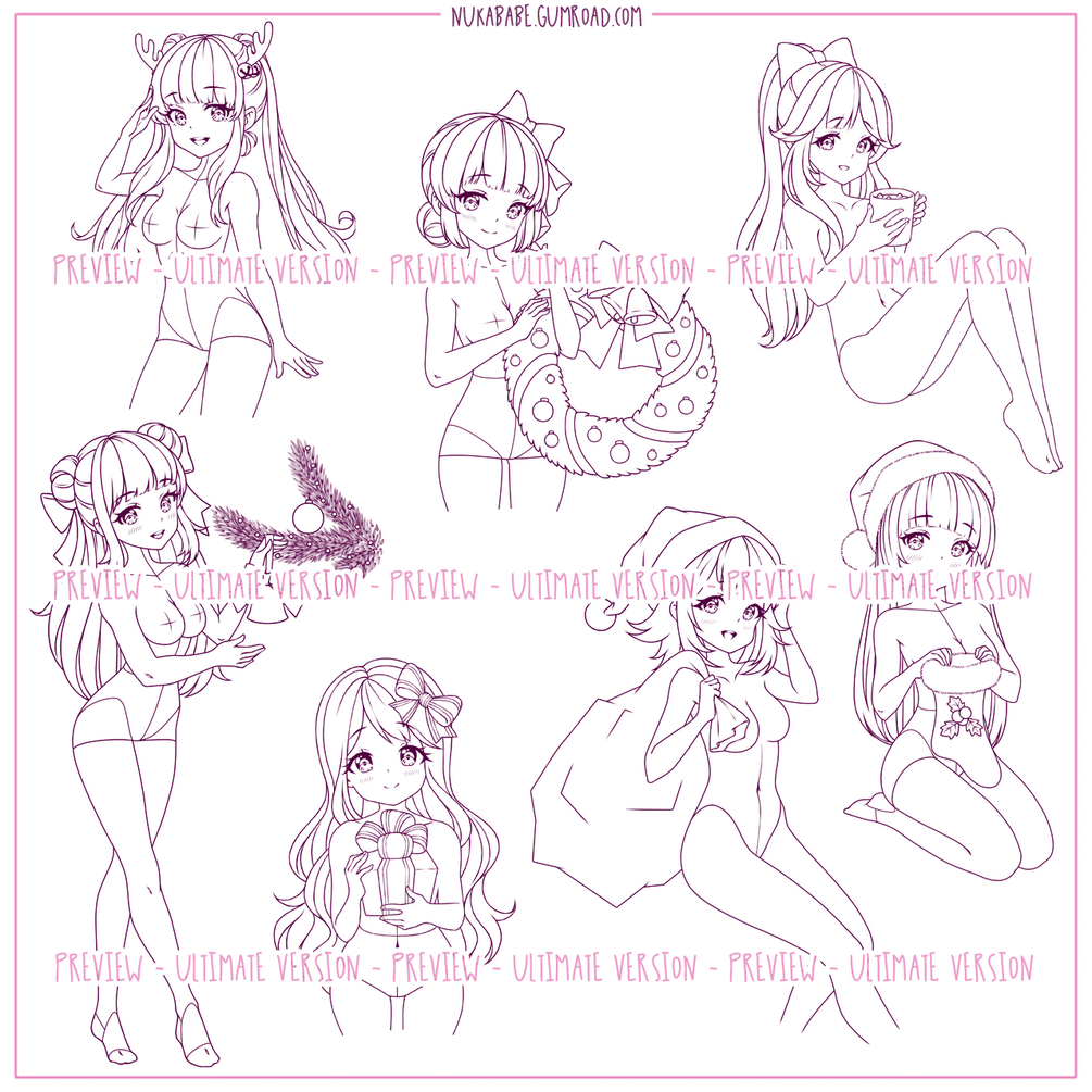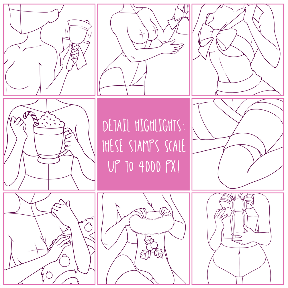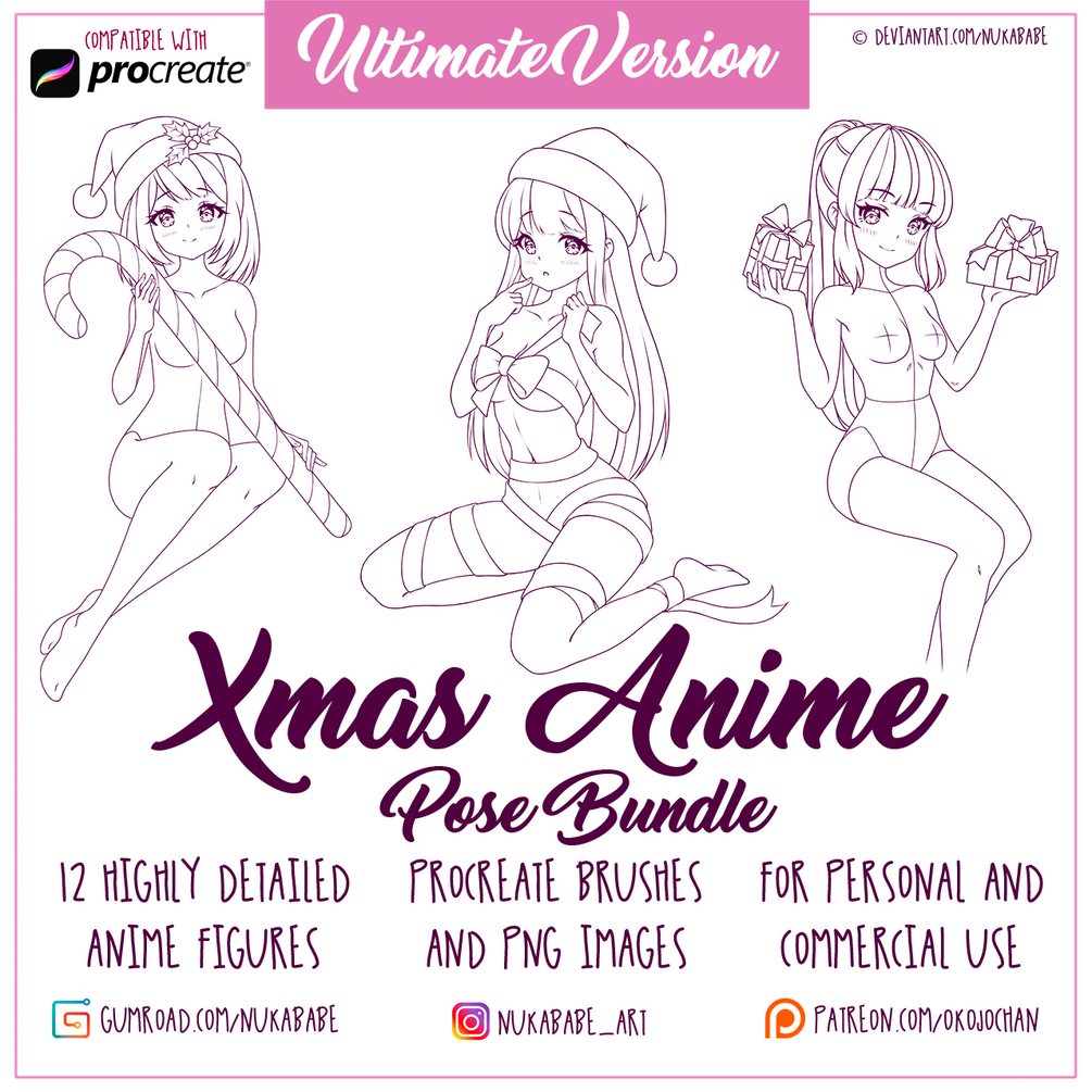 My very first anime stamp pack for Procreate is live! It contains 12 high resolution Christmas themed female body stamps in .brushset format loaded with ribbons, sugar canes, and marshmallows! A mix of full-body, three fourth, and half-body poses is included in this pack to give you a variety of composition choices. A PNG version of each pose is included as well, so these poses can be used in every drawing software that supports PNG files, not just in Procreate.