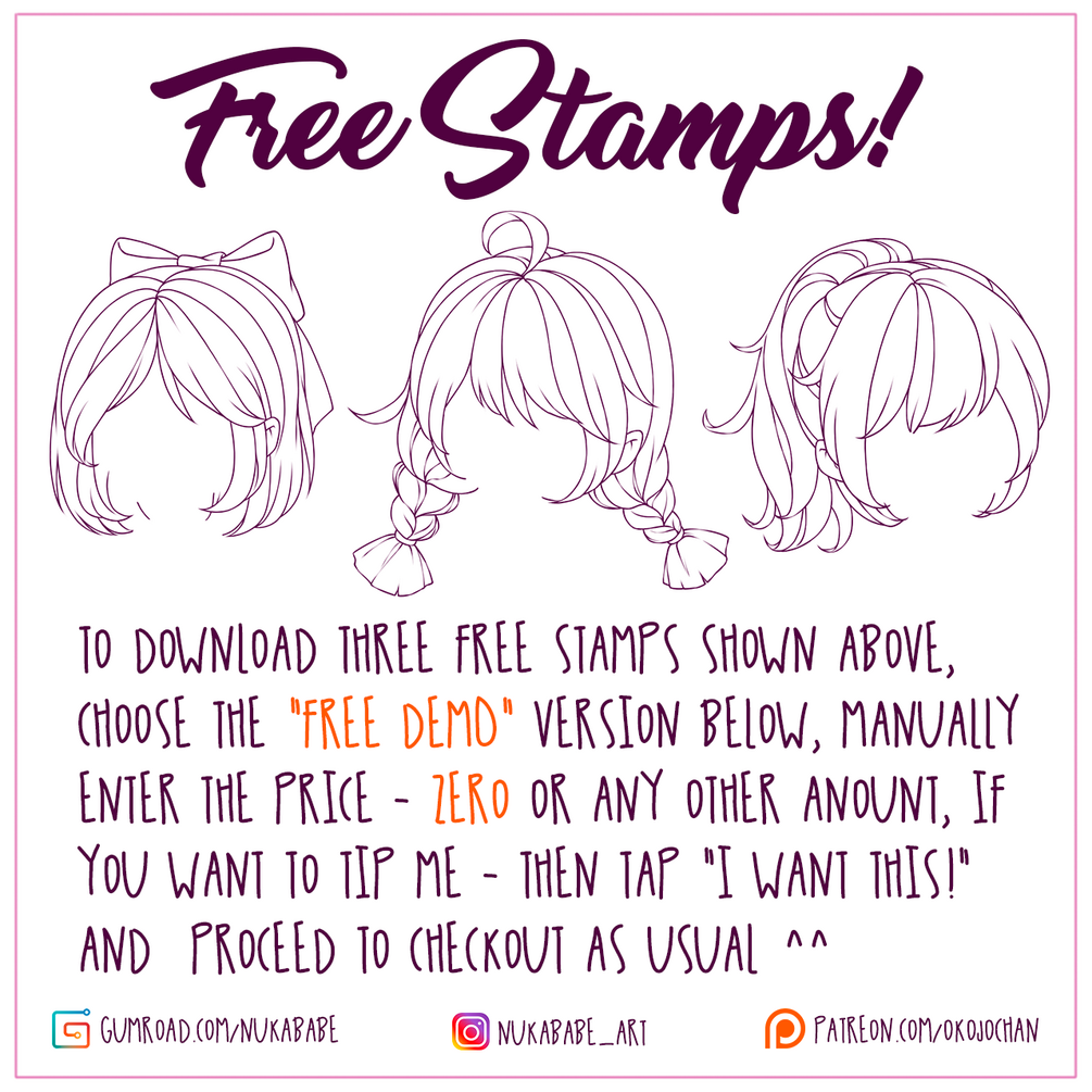 Unleash your inner stylist with this set of 30 female hair stamps for Procreate! Based on years of research into anime illustration and its subgenres, this stamp pack contains many of the hairstyles you often see on manga pages and in anime series. Most hairstyles from this pack have two versions - with ear(s) and without - but some are earless by nature. These hair stamps were originally developed for chibi figures, but they will work great with western style cartoon and other art styles! Like in my other stamp packs, each hair brush from this set has a high resolution PNG copy so you can use them not just in Procreate, but in any other drawing app that supports transparent PNG's.