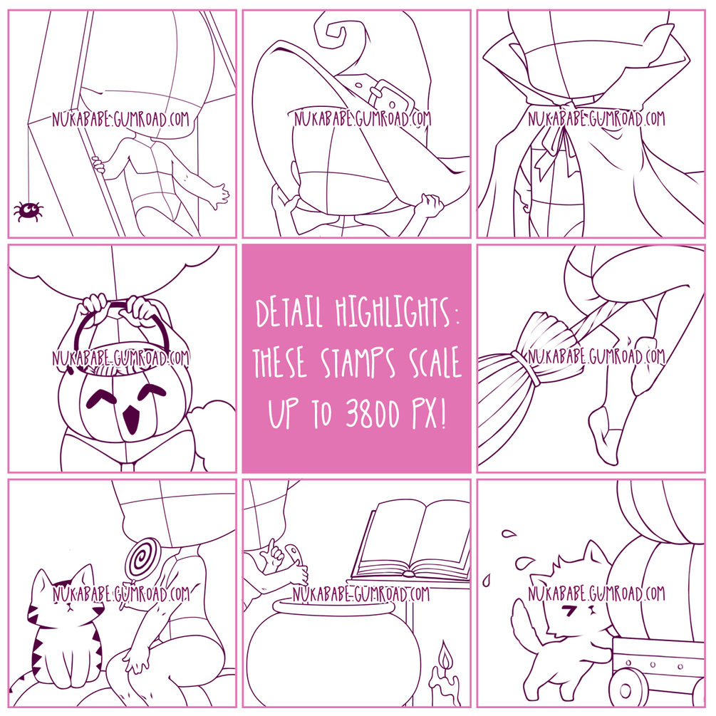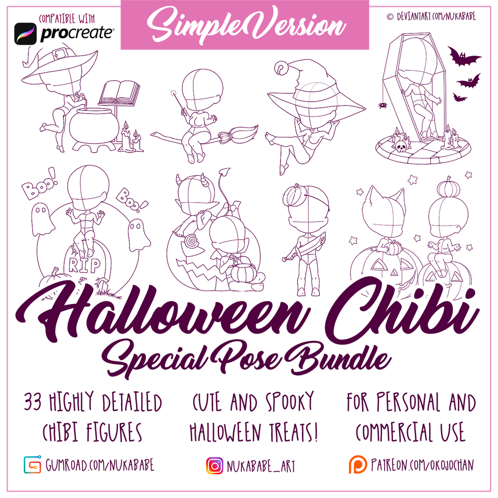 This bundle contains all Halloween-themed chibi poses that I have created so far, i.e. all bases from set #21, set #45, set #69, set #93, and set #112. If you have purchased one or more individual Halloween sets in the past, send an email to sales@nukababe.com with a proof of purchase, and I will create a unique discount code for you that will let you buy this bundle without having to pay for overlapping bases!