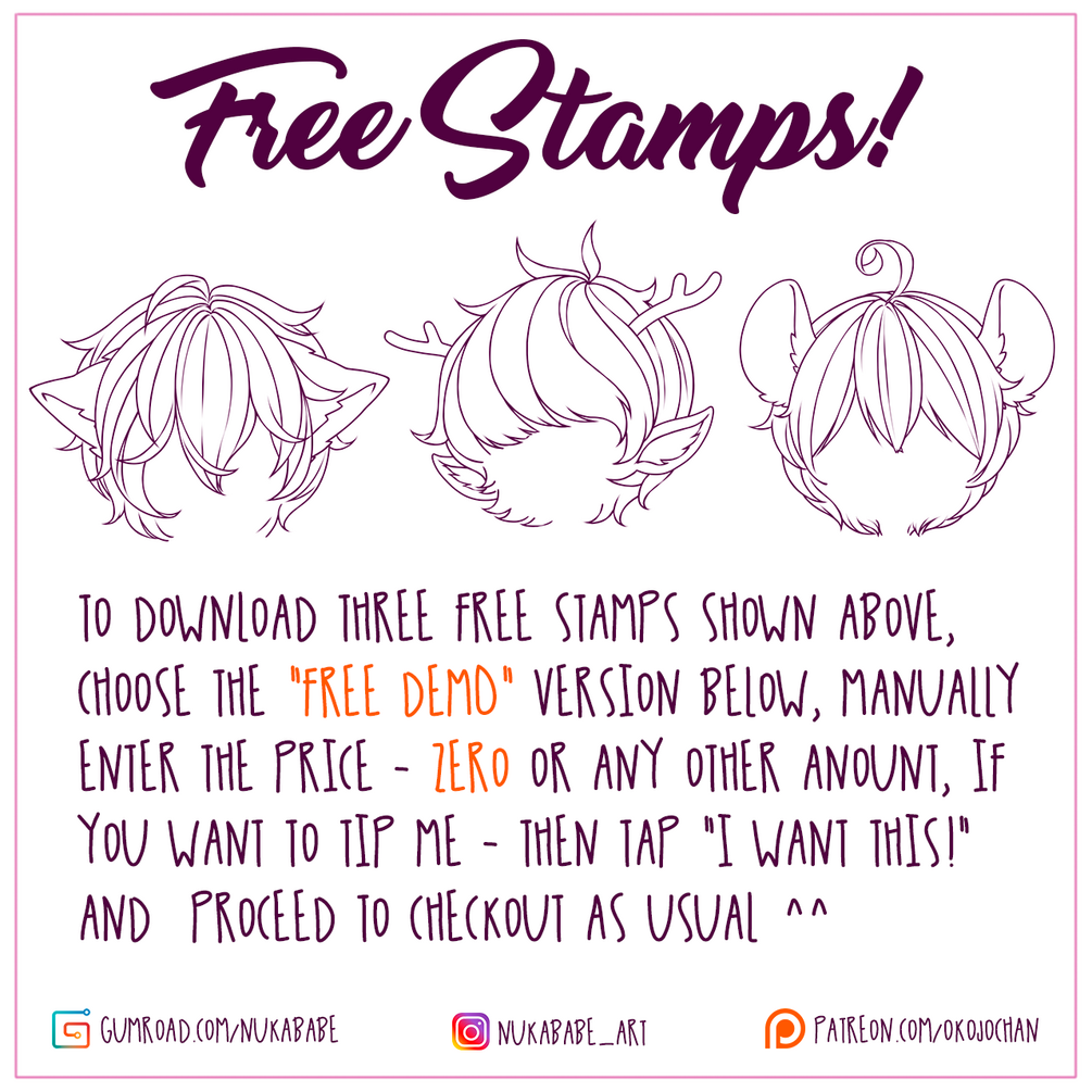 Hey furry fans, I've got something special for you in this Procreate hair brush set! ;) This stamp pack contains 30 highly detailed male and female hairstyles with various animal features, such as ears, horns, and antlers. With it you can explore dozens of fun design option for anthro, neko, furry, and kemonomimi characters! Hair guide brushes from this set represent different angles, so you can not only use them out of the box for character building, but also study hair shape and volume from them. A commercial license comes with the purchase, so you will be able to use these hair brushes for portrait commissions, adoptable design, and other commercial purposes. Like in my other stamp packs, each hair brush from this set has a high resolution PNG copy so you can use them not just in Procreate, but in any other drawing app that supports transparent PNG's, including Photoshop, PaintTool SAI, and Clip Studio Paint.